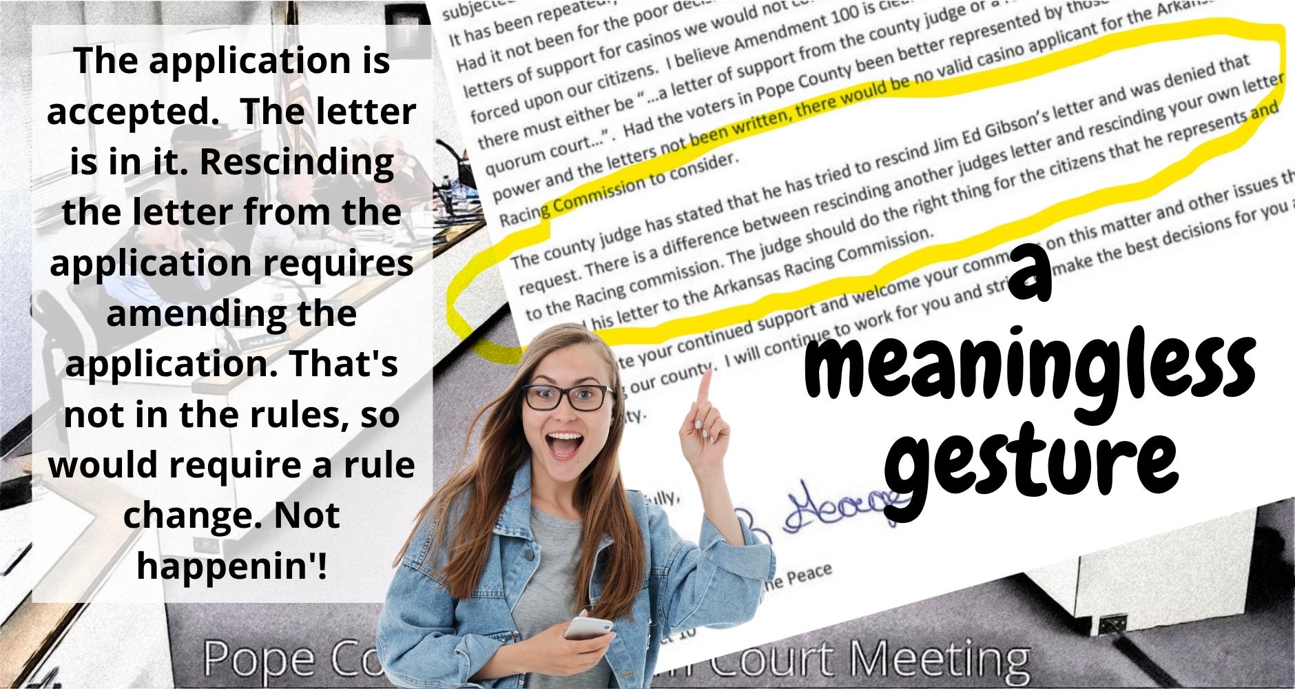 You may have seen that one of the JPs wrote a letter where he said, “The judge should do the right thing for the citizens that he represents and rescind his letter to the Arkansas Racing Commission.”
