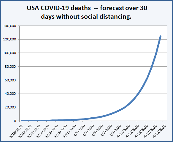The total US deaths related to COVID-19 over the next month will be somewhere less than the 120,000 suggested by an every-three-days doubling, hopefully significantly less. Social distancing and quarantine measures are breaking social connections and interactions between the infected and the uninfected.