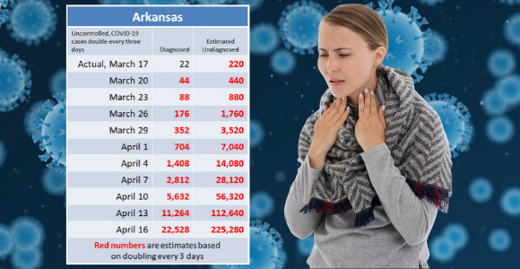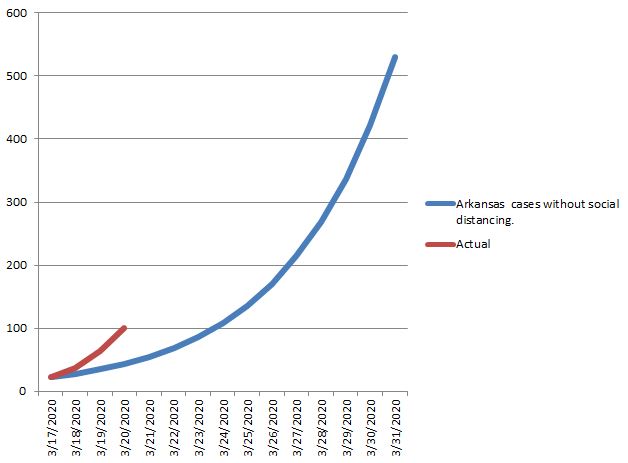 At 100 cases, Arkansas has already exceeded the estimate of 44 for March 20th in the table above by more than a factor of 2. This “spike” in confirmed cases is likely due, in part, to increased testing capabilities working the backlog of COVID-19 tests down.