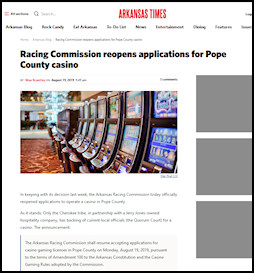 At least two lawsuits complicate the issue. One is by a Mississippi casino operator contending its letters of approval in 2018 by the then-Pope County judge and Russellville mayor make it a legitimate applicant. Another is a lawsuit seeking to force a local referendum required by a 2018 county ordinance before the Quorum Court may adopt a resolution in support of a casino.