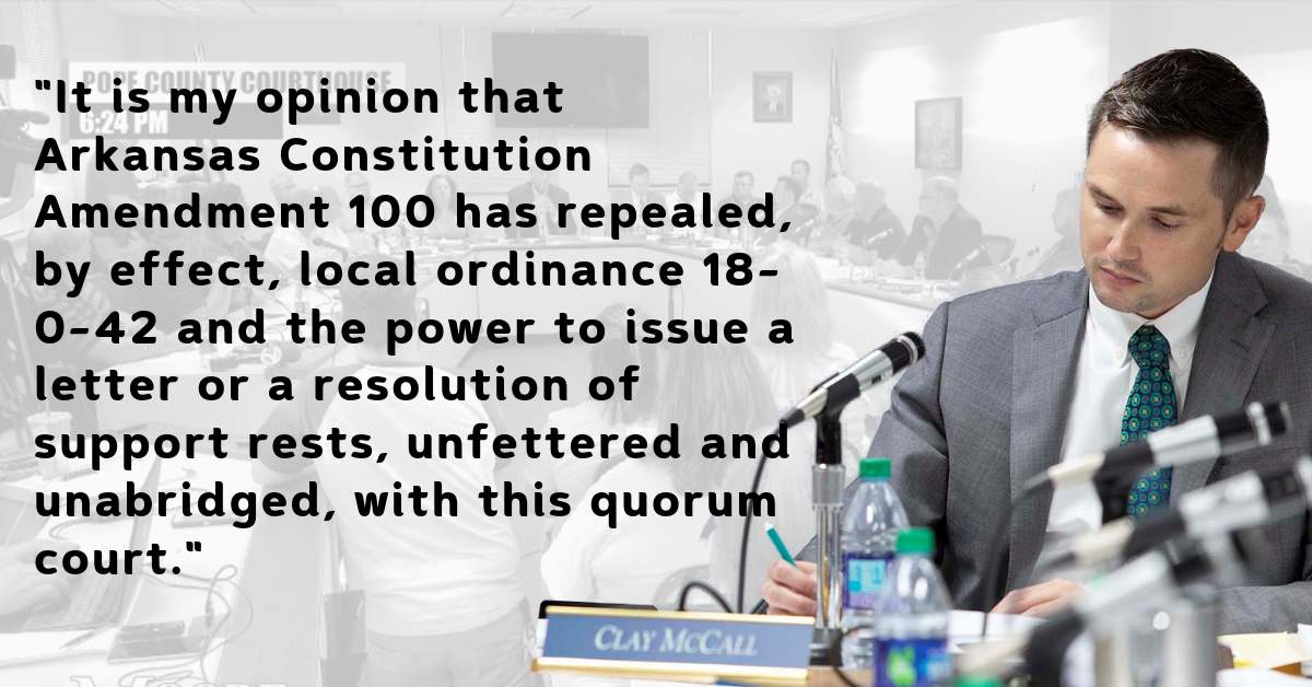 Local Ordinance 18-0-42, known as the local option ordinance, was an attempt to restrict the Pope County Judge and the Pope County Court.., Quorum Court, from issuing a letter of support or a resolution of support without first submitting the issue to a vote to the citizens of Pope County.